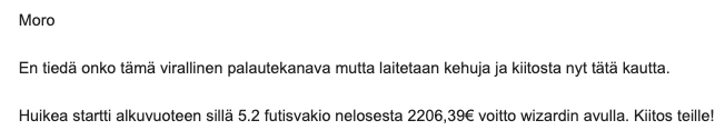 13.9. "Moi, kun yhdistetään kauden alun väärät reagoinnit pelikansalta ja lisäraha niin silloin kannattaa tehdä useampi lappu, esim Vakio Wizardilla. Voi käydä näin:" Liiga-vakiosta asiakkaallemme 5329,52 €!