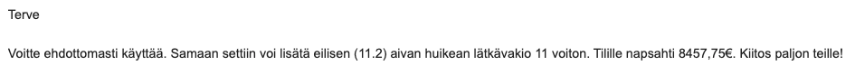 "Mahtava alku asiakkaana, teidän Moniveto vinkki (pieni systeemi) osuikin heti kerrasta ja palautusta tuli melkein 1000% pelin hintaan nähden, joten enköhän hyvillä mielin suosittele teitä myös mahdollisesti muille kiinnostuneille jatkossa." -KR